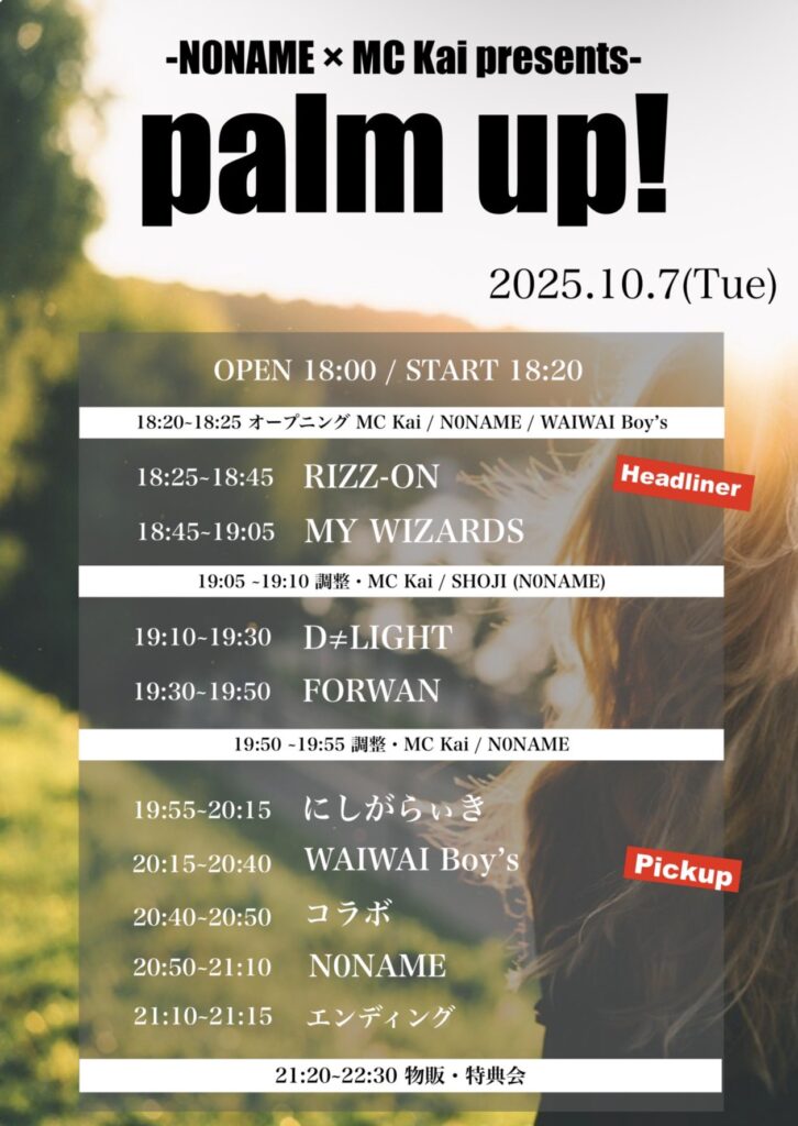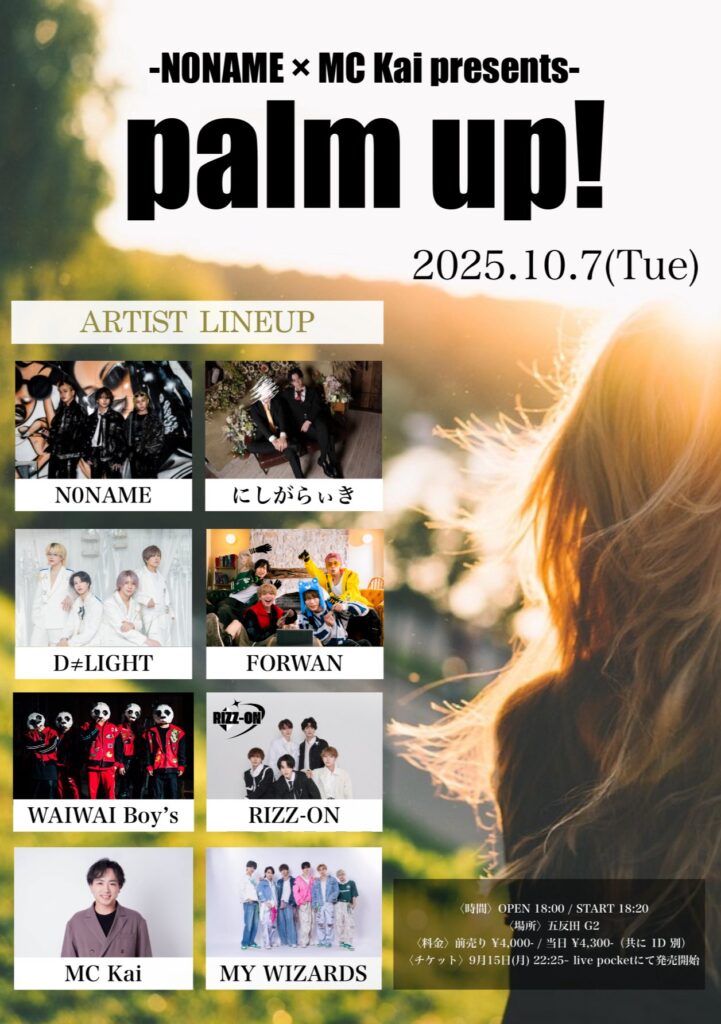 2025/10/7(火)に開催いたします、palm up!の出演が決定しましたので詳細をお知らせいたします。